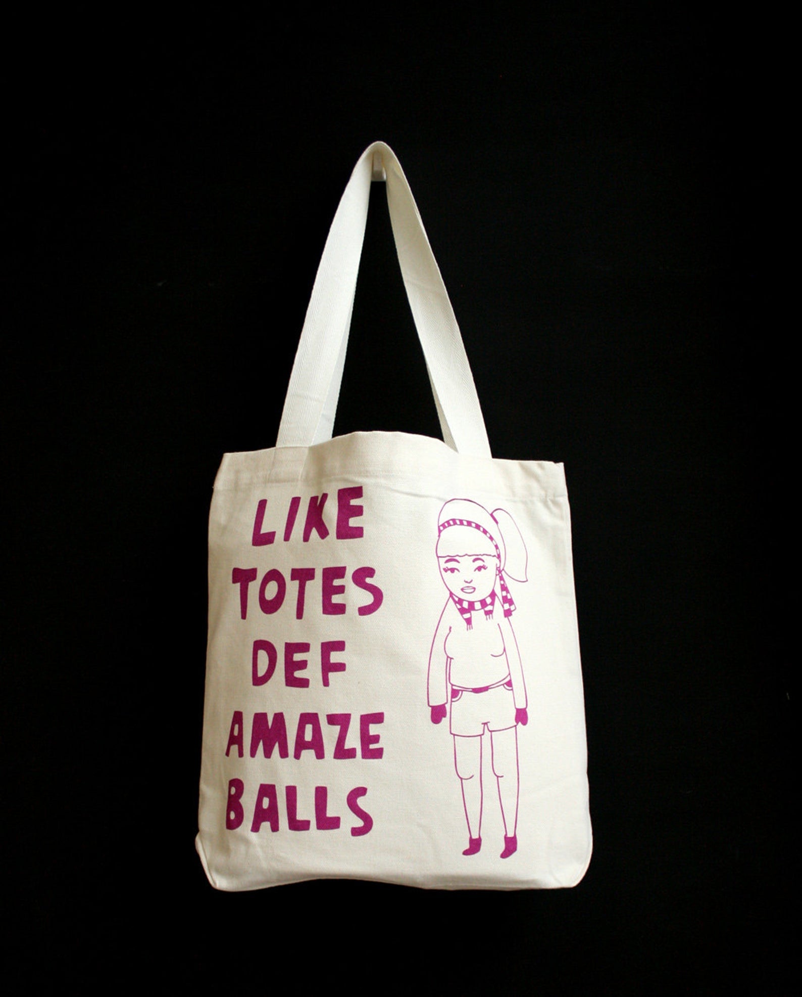 This tote bag is based on their "You're Totes Def Amaze Balls" card and is printed with a bright and cheery purple water based ink onto 100% cotton canvas, this tote bag is sure to bring a smile to your dial.