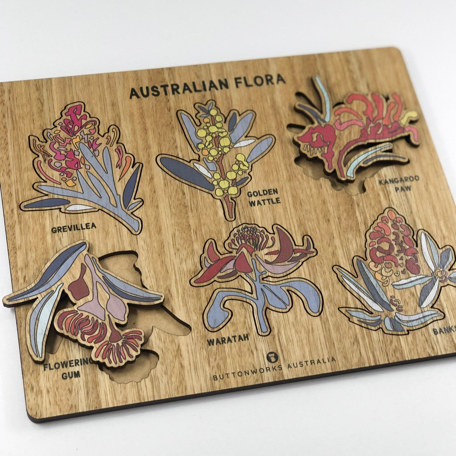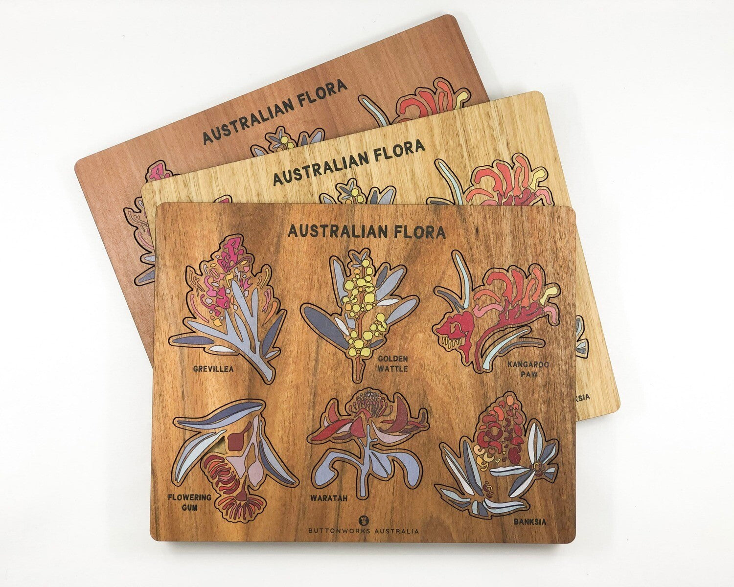 Australian flora puzzle, featuring well known Australian native flora. Lightweight, flat packed and wrapped for easy postage and travelling (size 25cm x 20cm). Each puzzle is made from sustainably sourced Australian Golden Sassafras timber. Every tree is different, therefore the colour and grain of timber varies, making each product unique. The real work has been done by the tree, Buttonworks have added the craftwork.