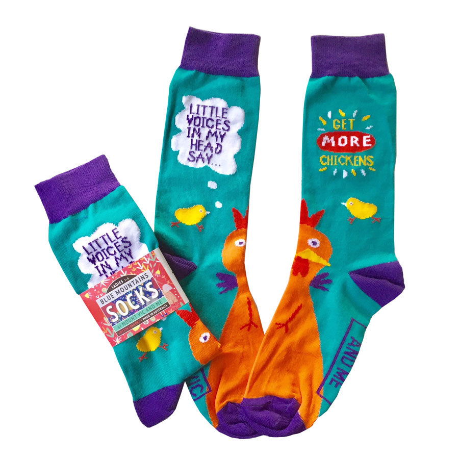 Hooray to Aussie made socks! ‘Little Voices in my head say get more chickens’ socks have landed. Perfect as dress socks, hiking, the board room and just a lovely shot of colour when you need to spruce up your garb.