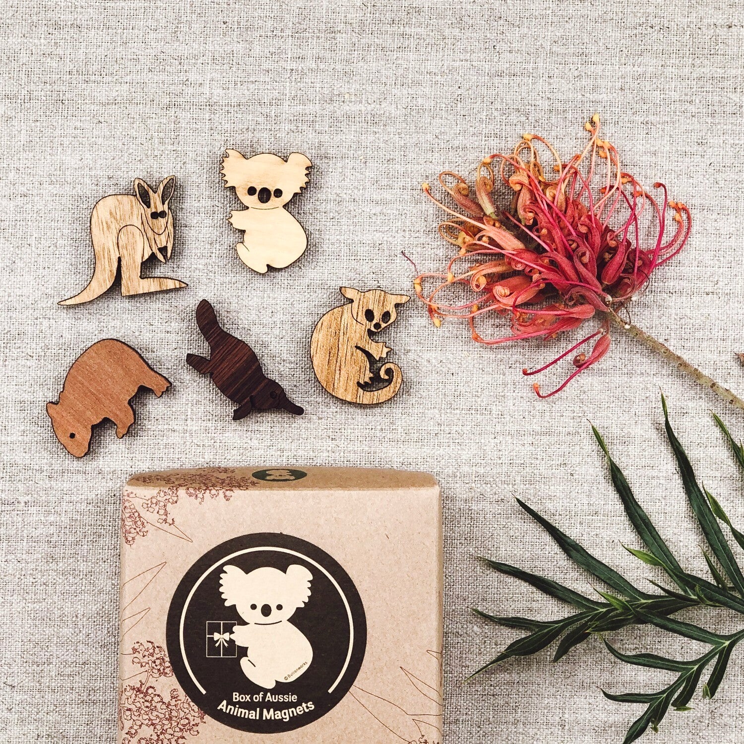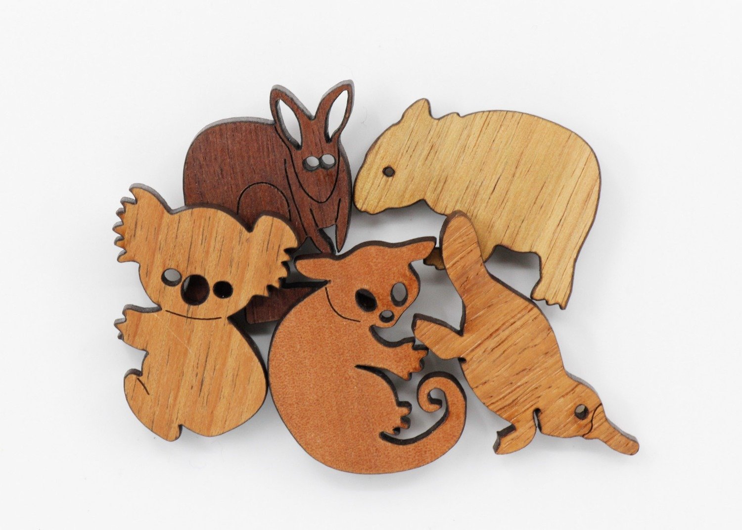 Set of 5 Aussie animal design magnets cut from various sustainably harvested timber veneers. Animals approx 4cm x 4.5cm and arrive in a recycled cardboard gift box. Every tree is different, therefore the colour and grain of timber varies, making each of our products unique. The real work has been done by the tree, they have added the craftwork.