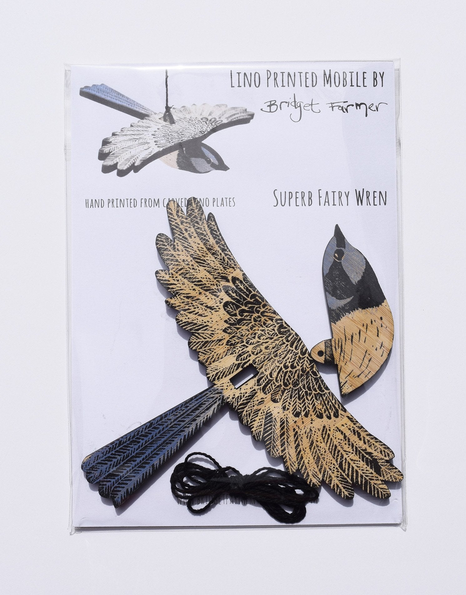 This is a mobile of a superb fairy-wren, or to be more precise a male superb fairy wren. It is made of strong, laser cut, layered plywood and hand printed by the amazing Bridget Farmer in multiple layers from hand cut lino plates. So lovely!