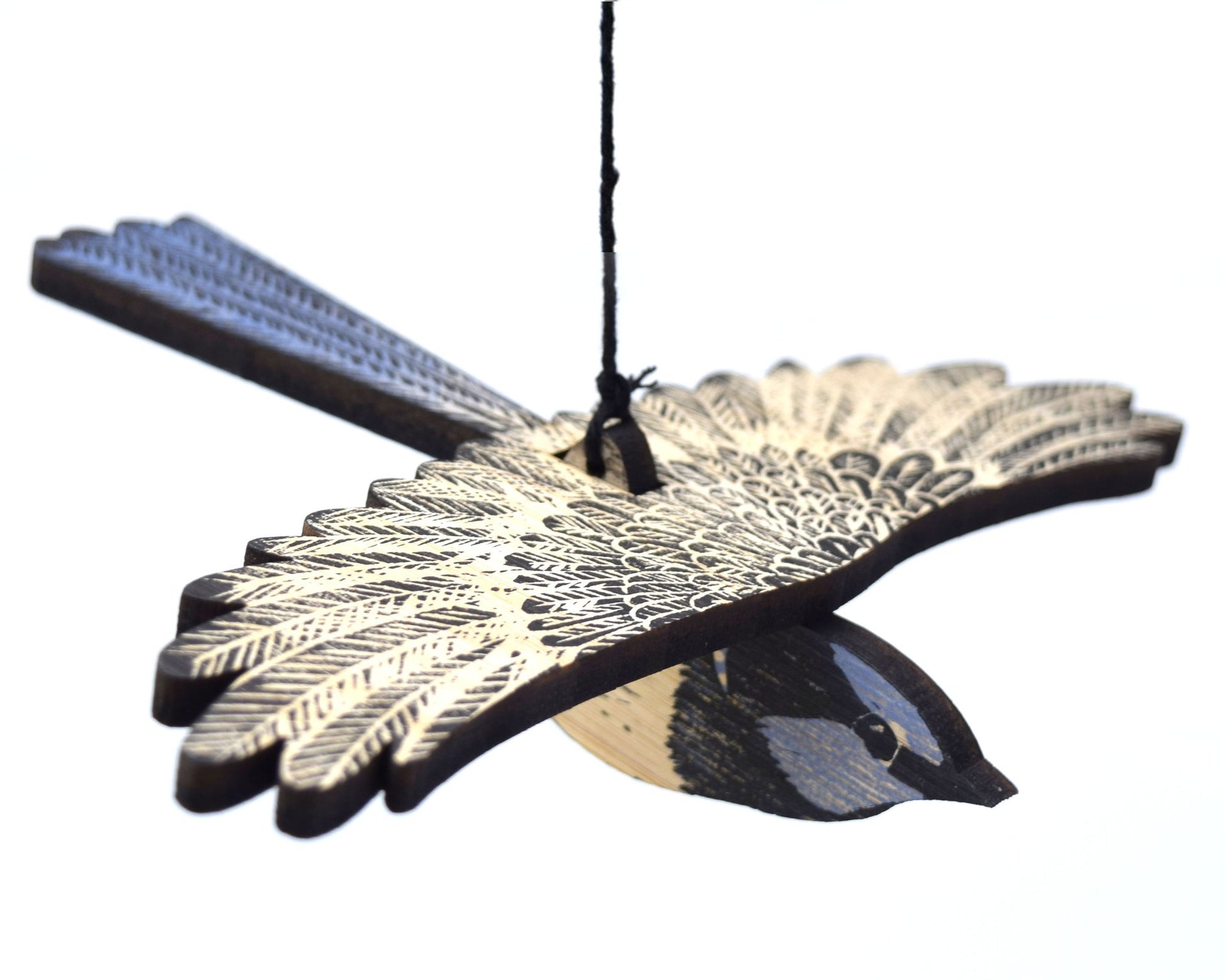 Packaged flat, customers simply slot the pieces together and use the twine to hang the bird.