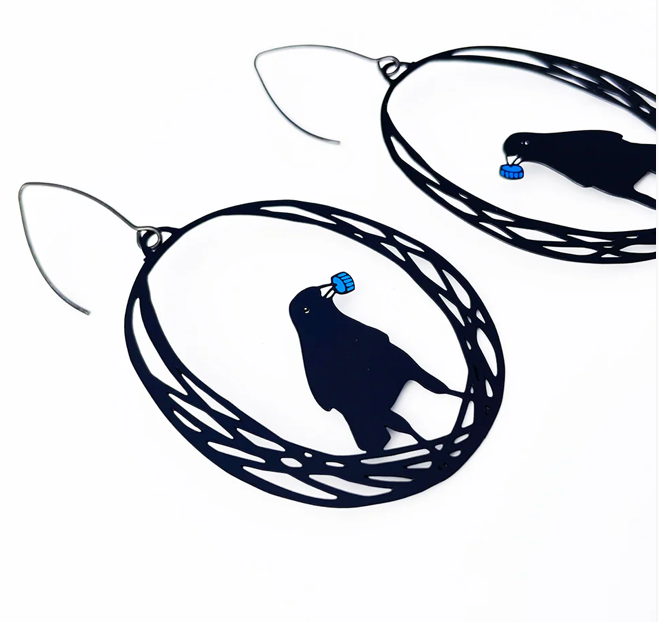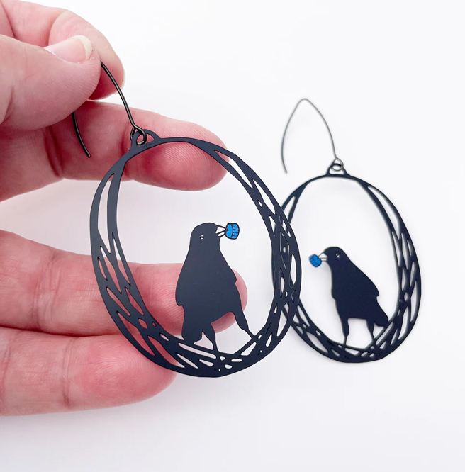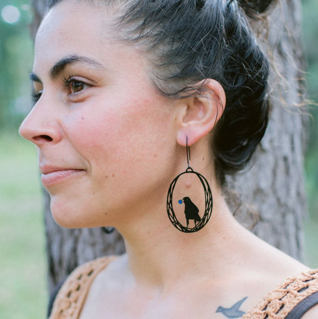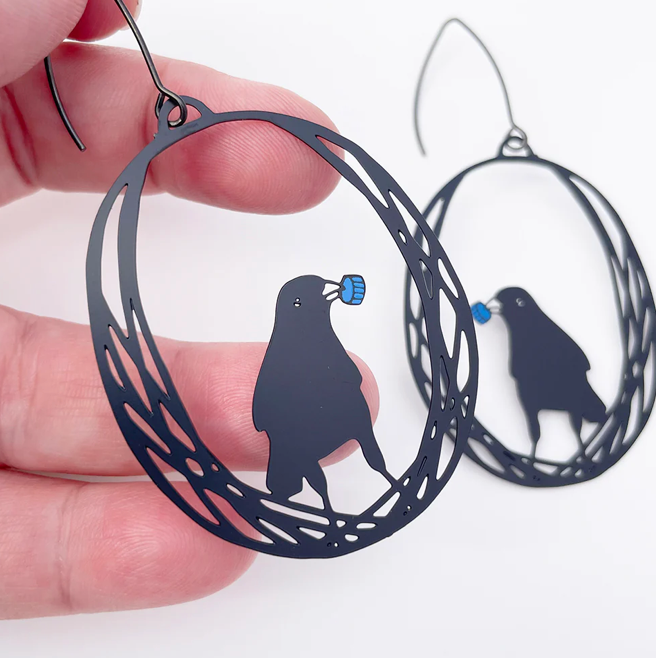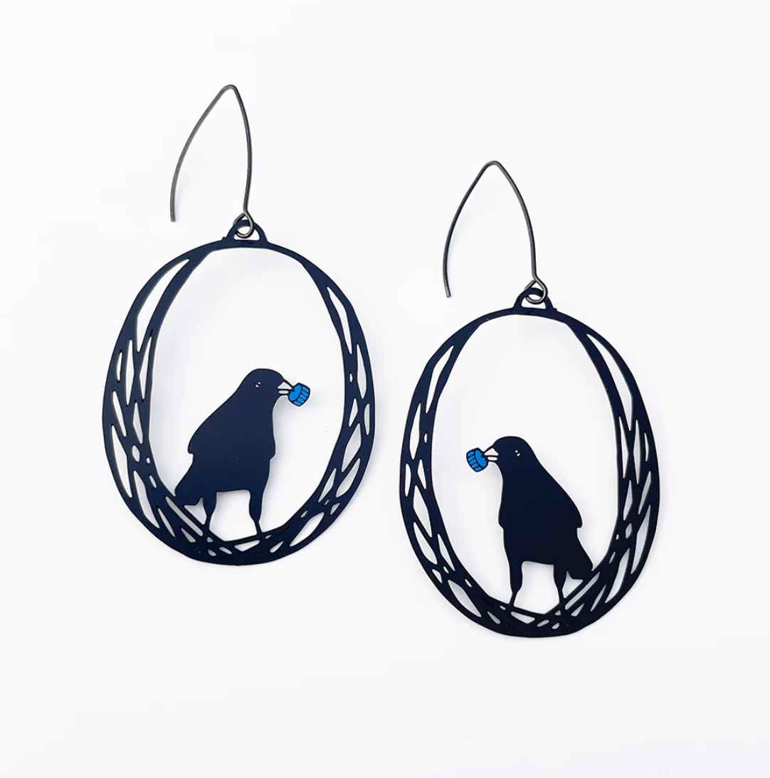 Another stunning Australian bird to add to your earring collection. Our cheeky little Bowerbird is made from lightweight steel and features a tiny blue bottle cap in its mouth.
