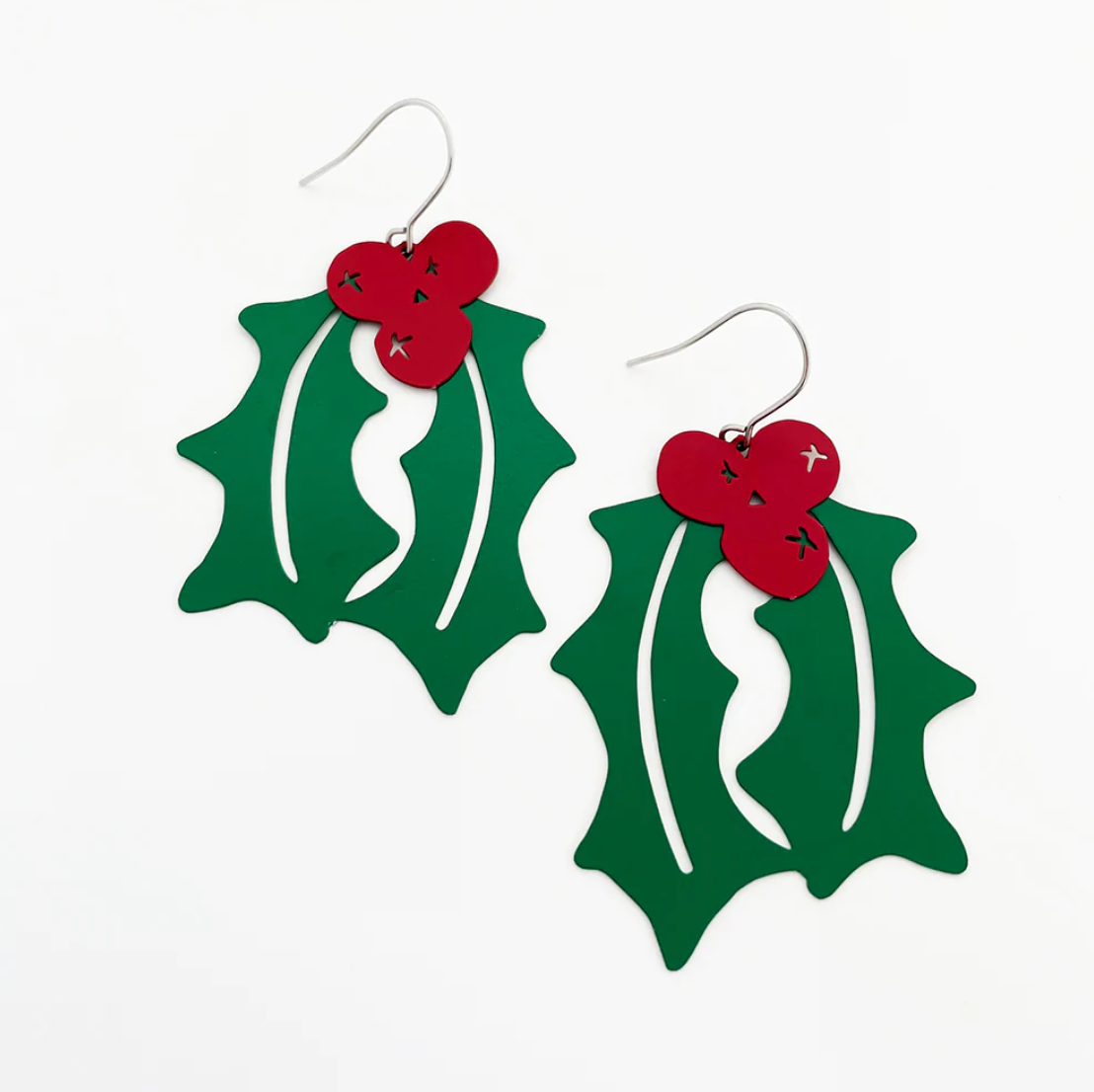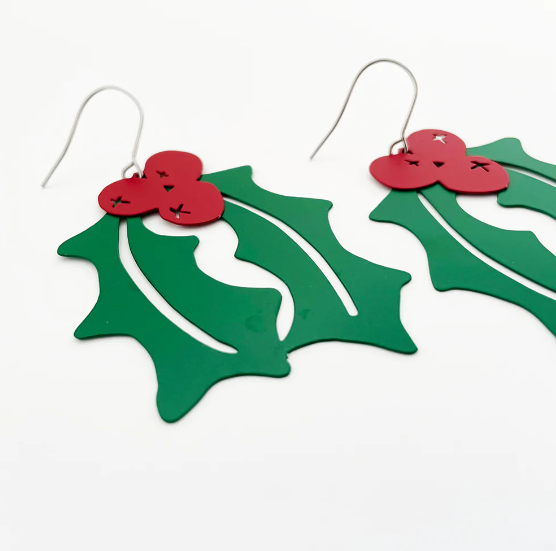 DENZ "Holly" Christmas painted steel dangles statement earrings