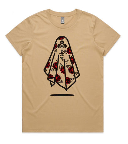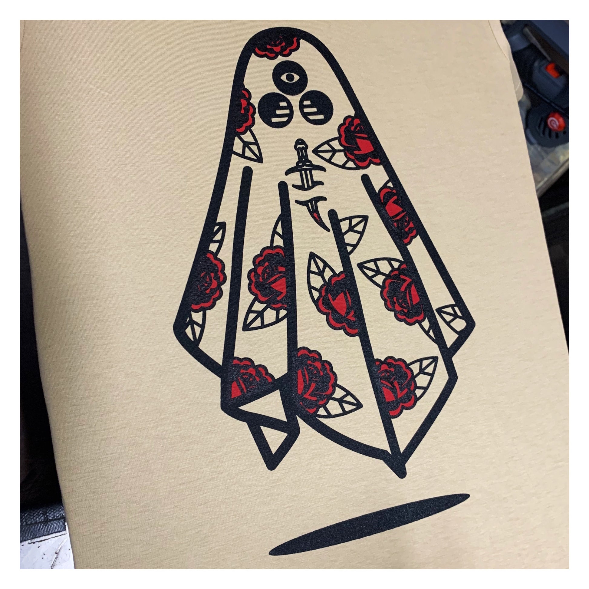Tan T-shirt with black and crimson print.