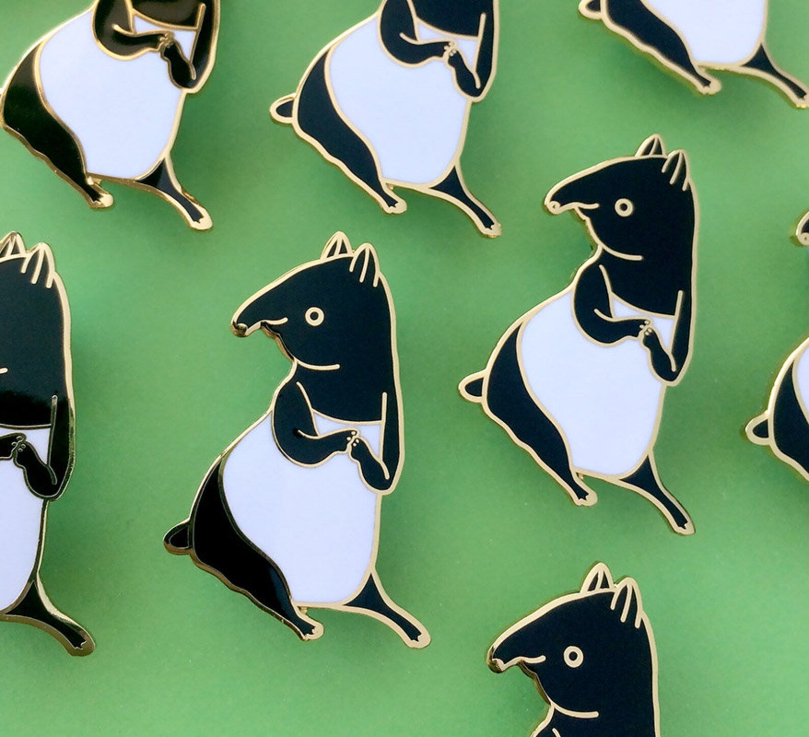 This listing is for one 35mm x 45mm black and white hard enamel pin with shiny gold metal finish. This pin has two pin backs held in place with secure rubber backings for extra security and stability.