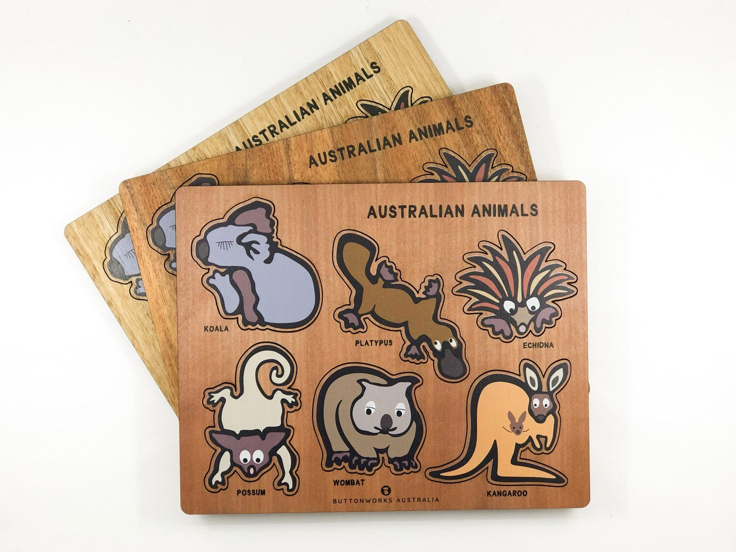 Jolly Animal puzzle, featuring well known Australian native animals. Lightweight, flat packed and wrapped for easy postage and travelling (size 25cm x 20cm). Each puzzle is made from sustainably sourced Australian Queensland Coachwood timber. Every tree is different, therefore the colour and grain of timber varies, making each product unique. The real work has been done by the tree, Buttonworks have added the craftwork.