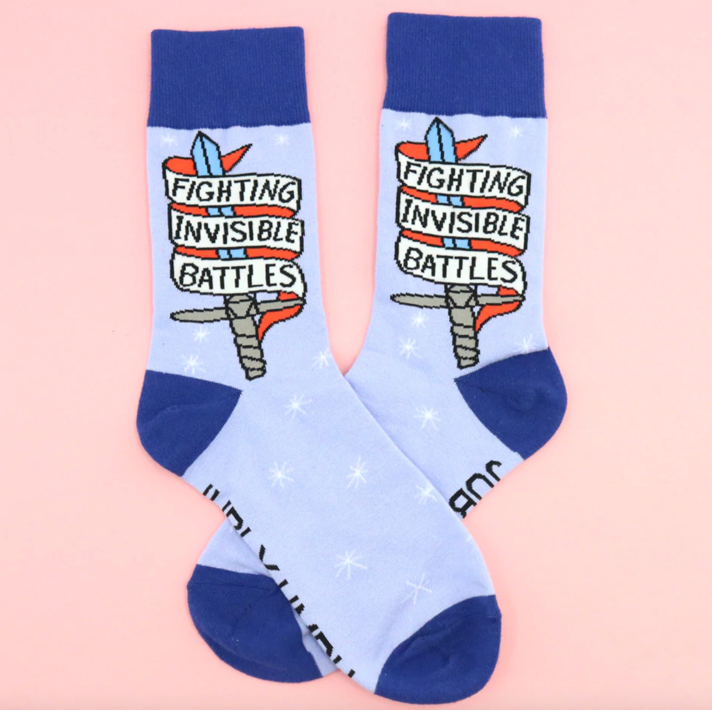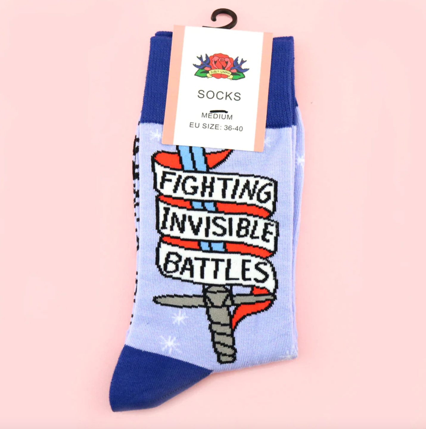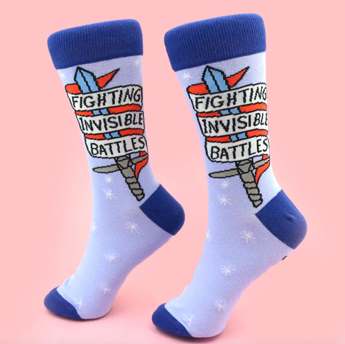 Not all battles are loud, violent and gory. Some are quiet, intense, and invisible. People frequently forget that sometimes the most difficult struggles are internal, so here are some socks for those whose struggle might go unnoticed, or unappreciated.