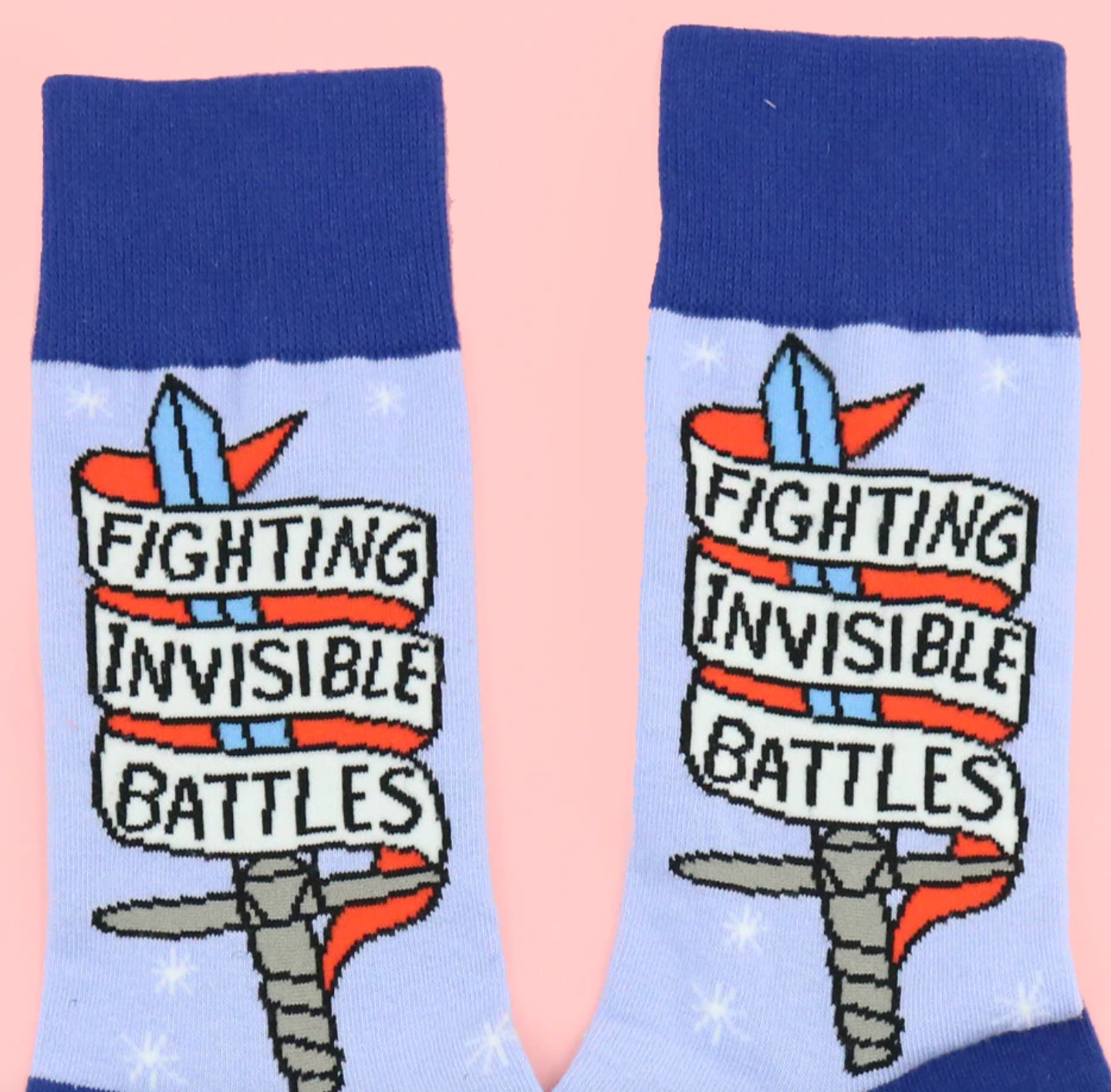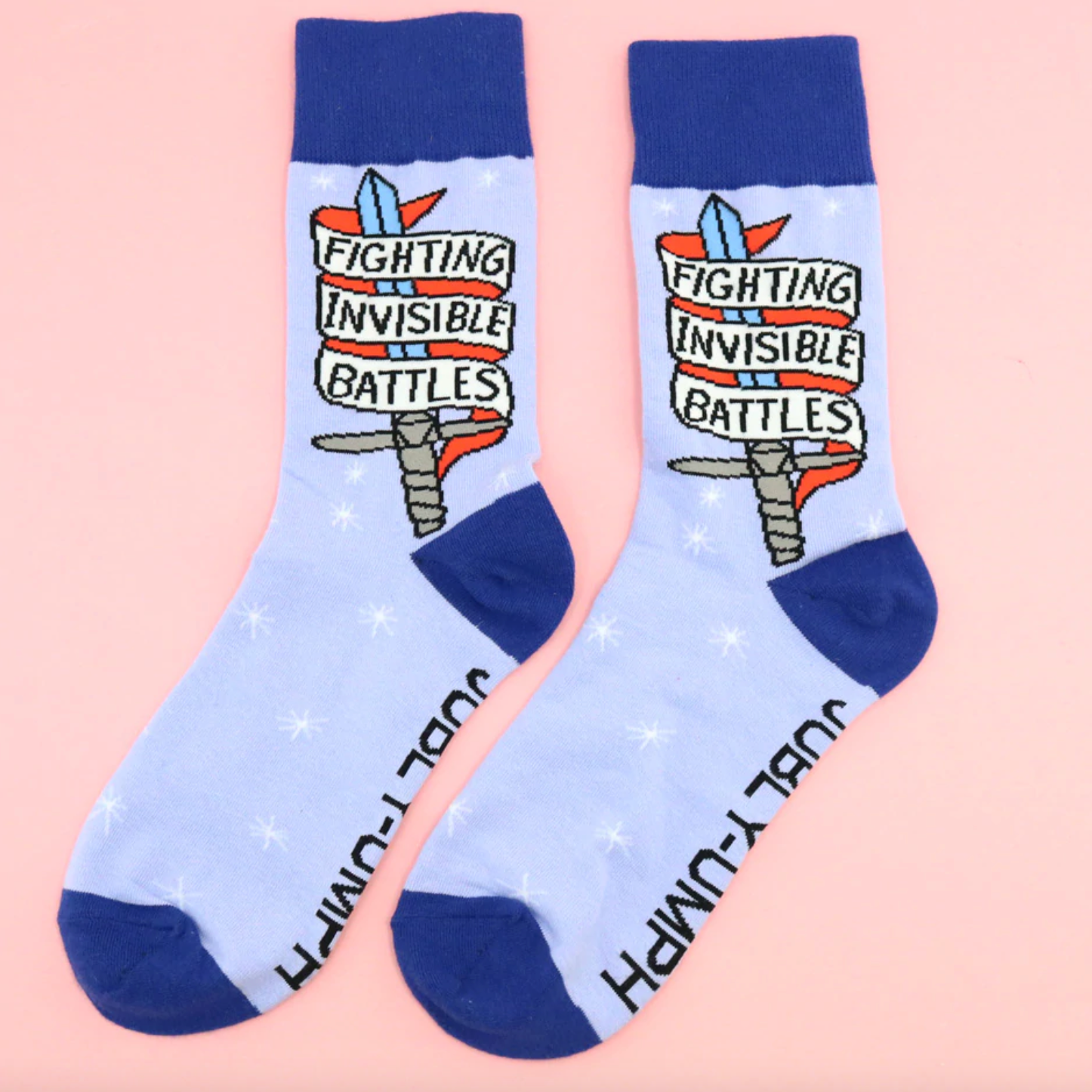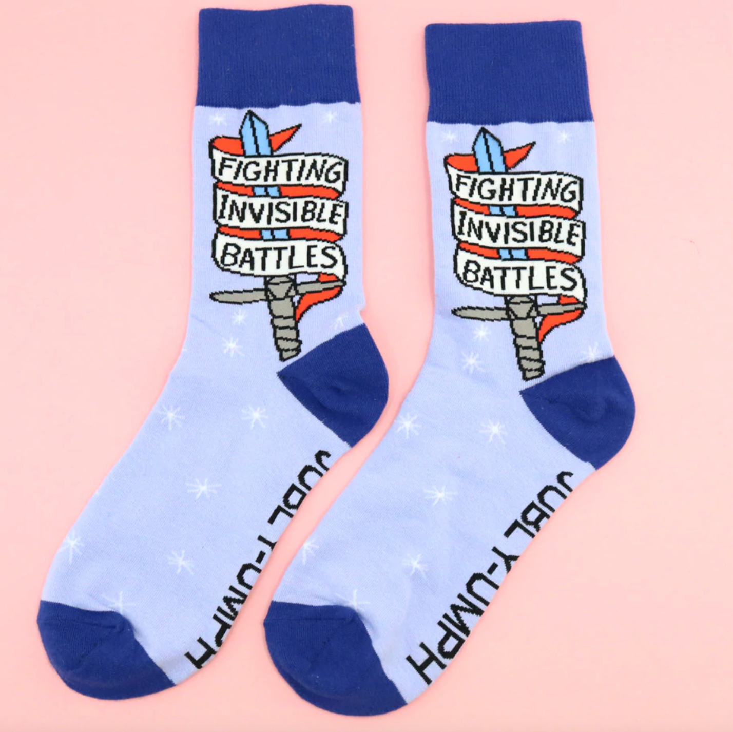 Not all battles are loud, violent and gory. Some are quiet, intense, and invisible. People frequently forget that sometimes the most difficult struggles are internal, so here are some socks for those whose struggle might go unnoticed, or unappreciated.