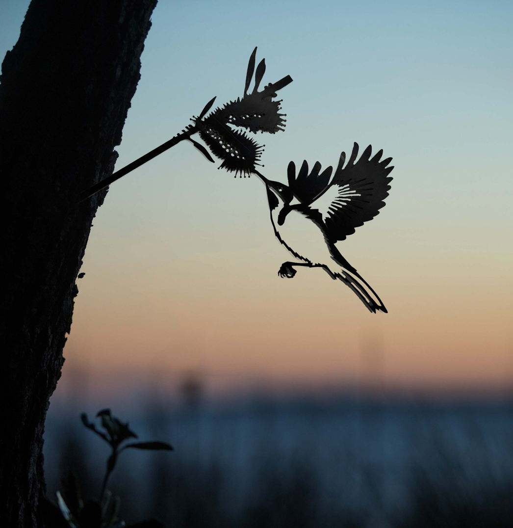 Metalbirds are made from Corten® which is designed to rust. This gives them long term protection against the elements, and a beautiful patina that shifts with the season. This means paint won’t stay on for long. If you want to add colour to them, then we recommend having them professionally powder coated. It's easily hammered into most wooden structures and will rust to a deep brown. The hammering of a steel ‘peg’ into a tree will not do any damage to it. It may cause the tree to lose some sap in the short term but will not do any medium or long term damage to it.