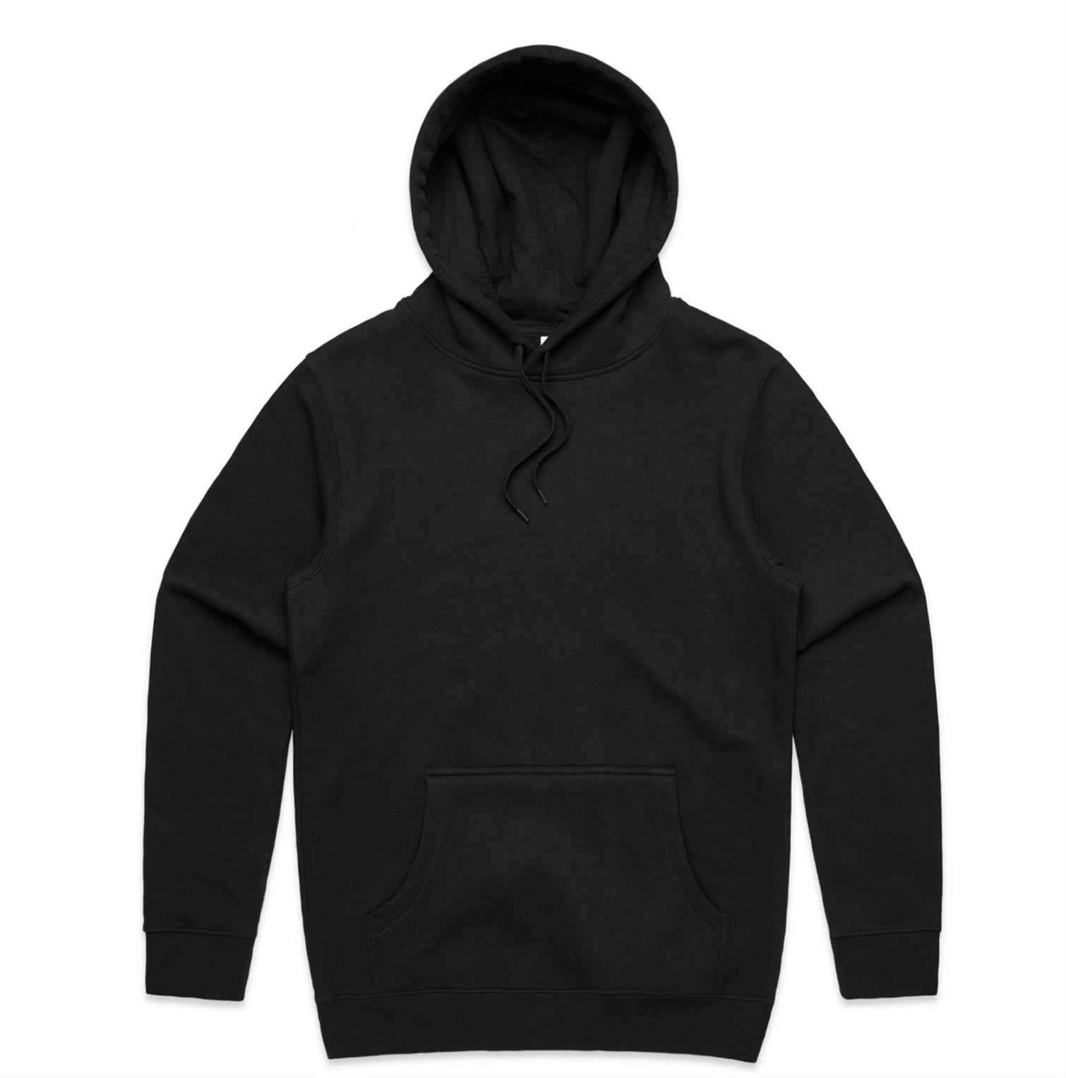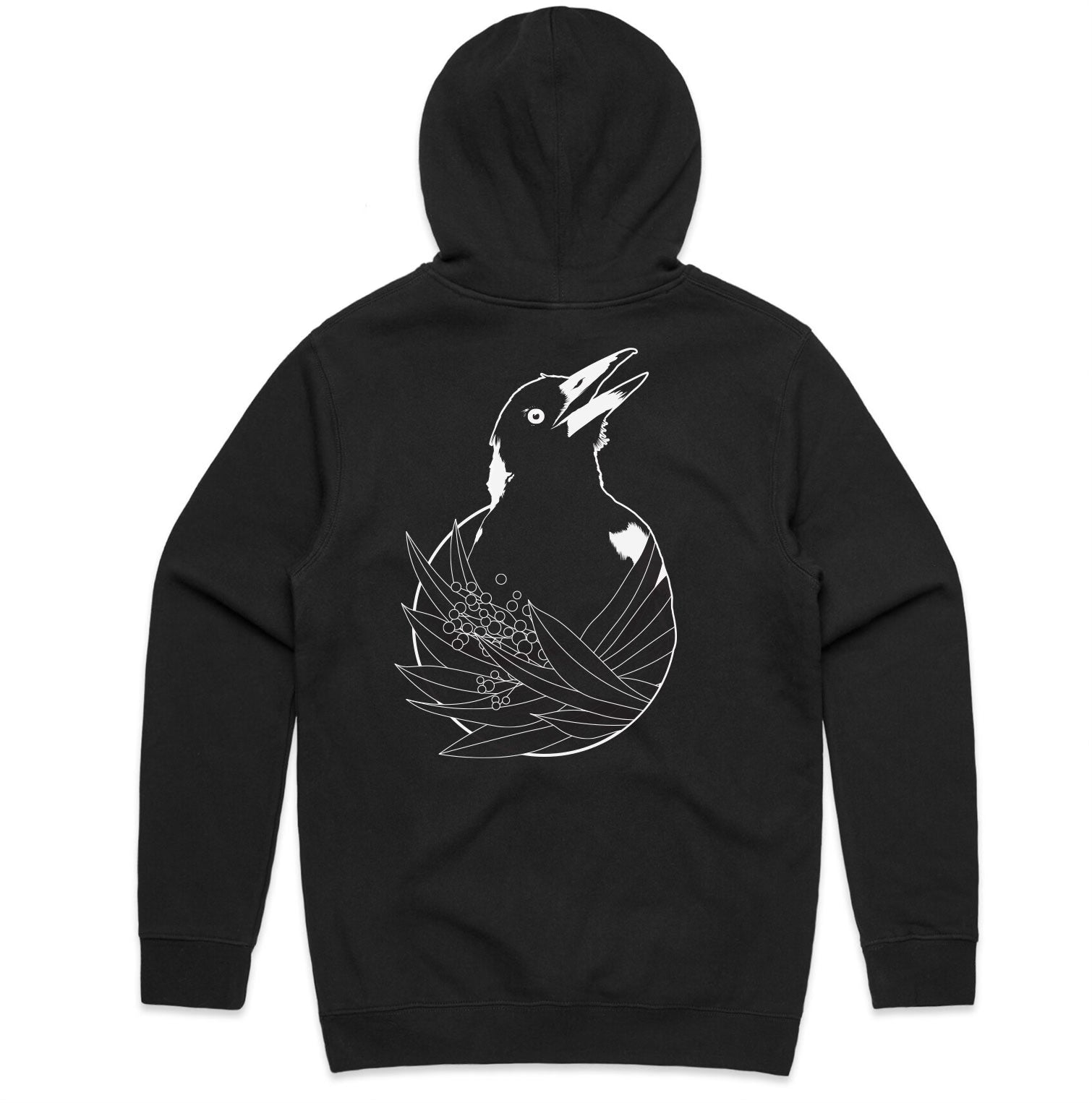 UNISEX Black Hood with white print of Old Mate© design on its back.