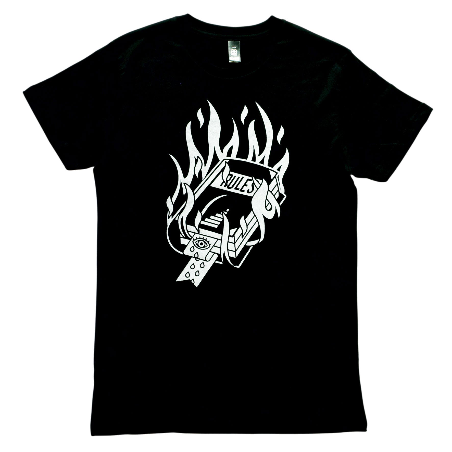 Black T-shirt with white print.