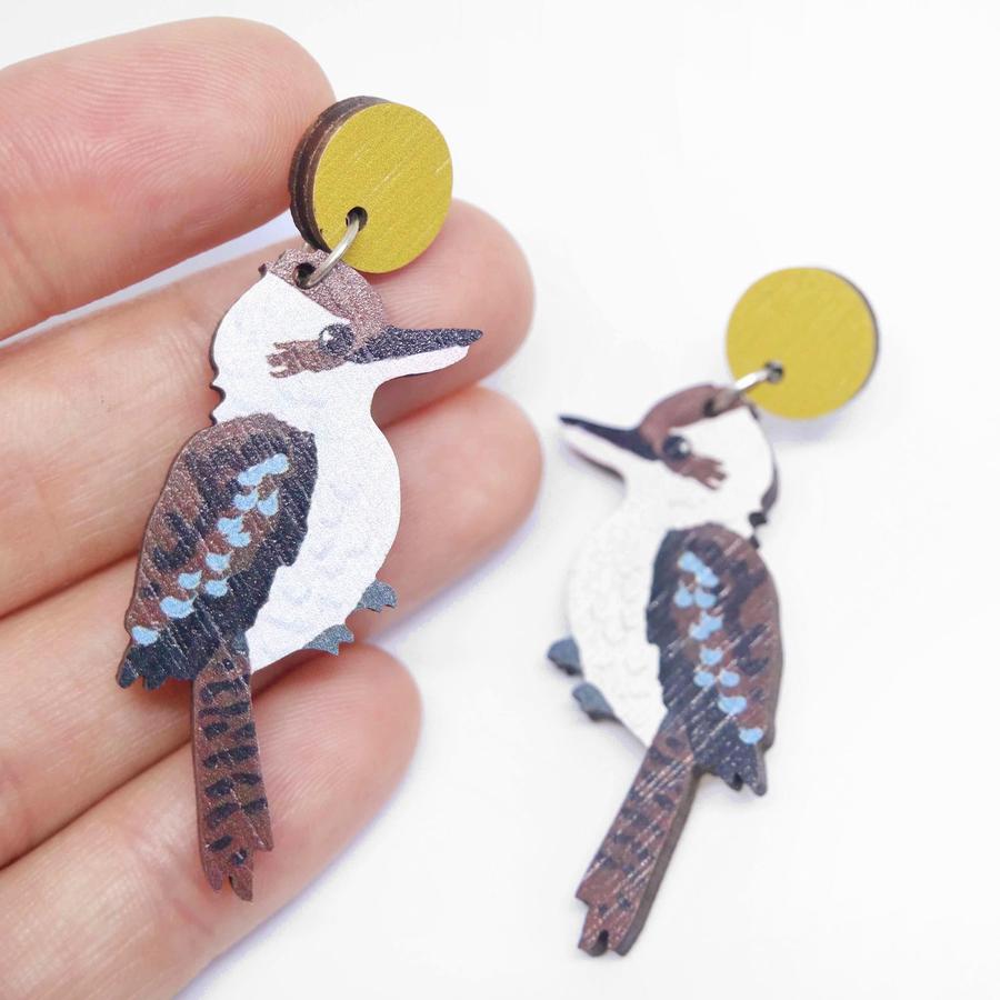 Add some Aussie flavour to your wardrobe with these friendly light weight cuties! The kookaburras are printed on 3mm thick ply wood and cut to shape and then constructed by Philippa - Pixie Nut & Co - in NSW Australia.