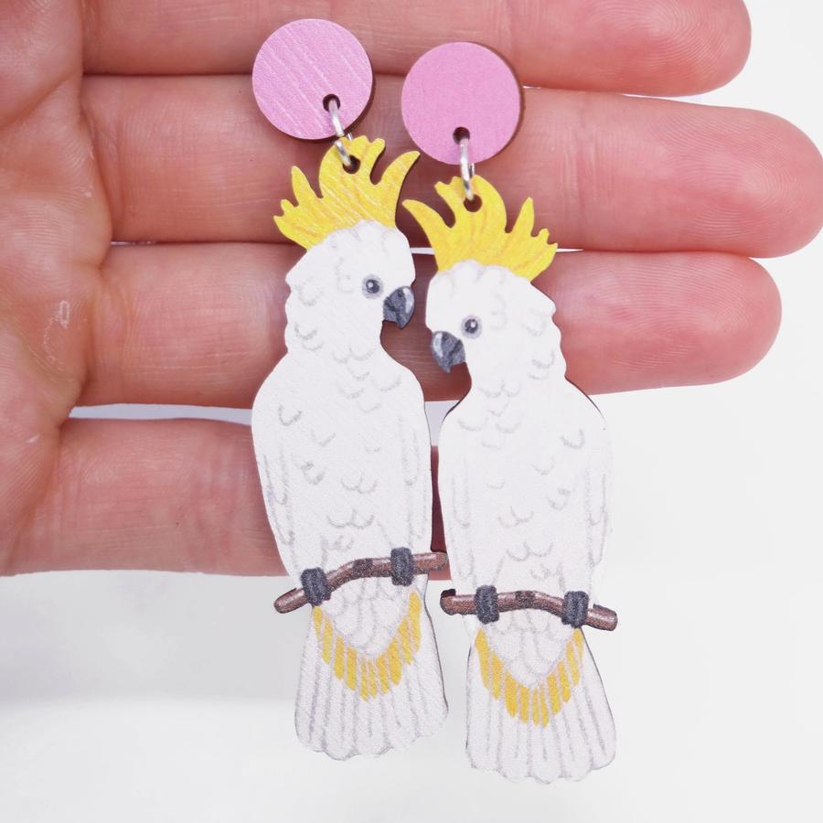 Add some colour to your wardrobe with these friendly light weight cuties! The cockatoos are printed on 3mm thick ply wood and cut to shape and then constructed by Philippa - Pixie Nut & Co - in NSW Australia.