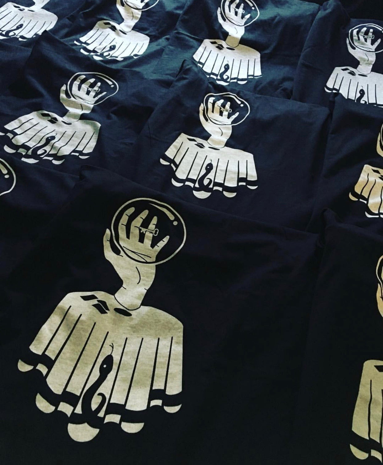 Please note: each T-shirt is hand printed by Sean, so there may be small inconsistencies in print and colour as he is only human.