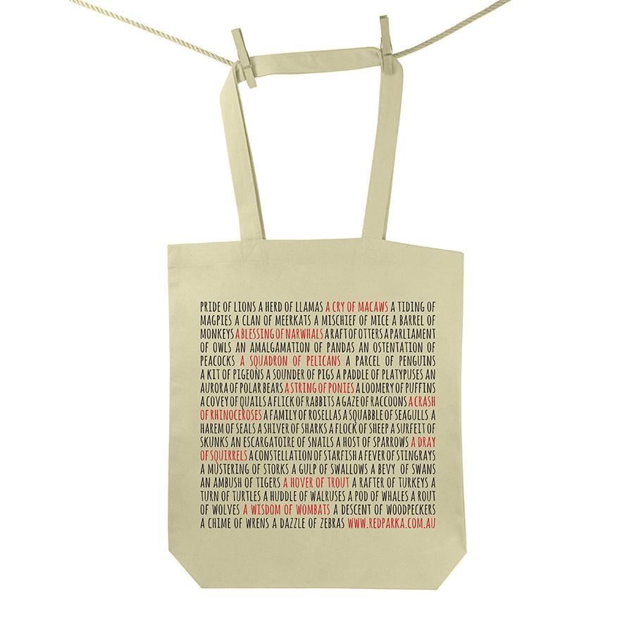 Collective Nouns tote bag Designed by the awesome Jen Cossins - Red Parka. Printed on 100% Indian Cotton. Just adorable!!