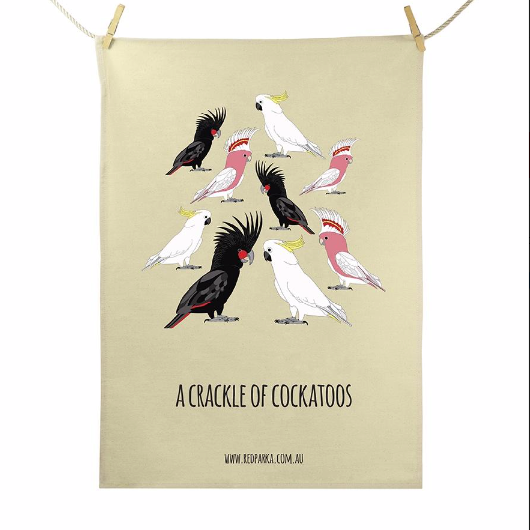 A Crackle of Cockatoos Teatowel Designed by the awesome Jen Cossins - Red Parka. Printed on 100% Indian Cotton. Just adorable!!